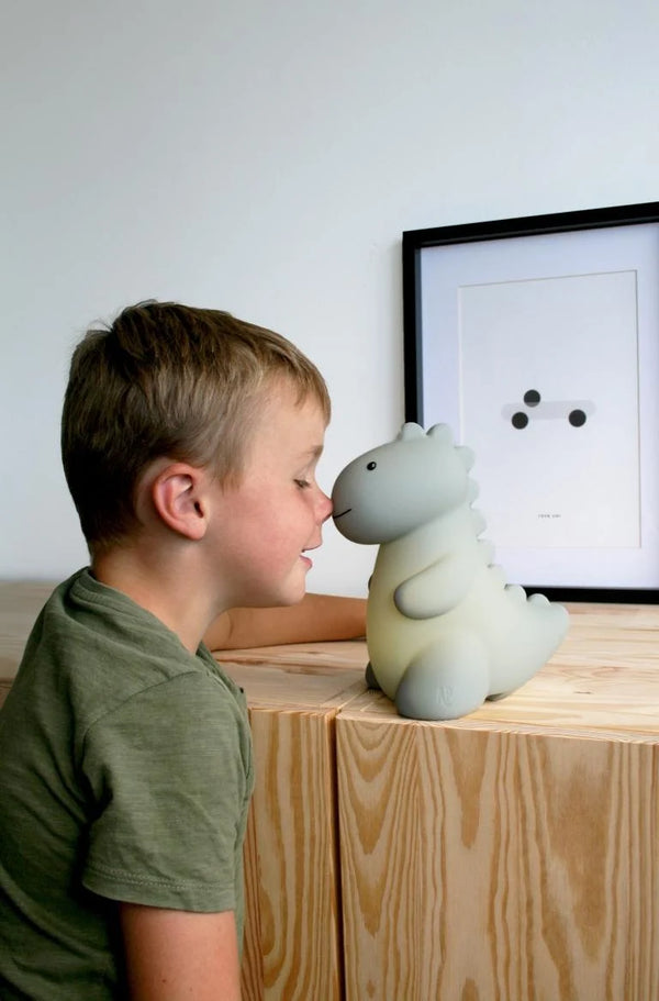 Met deze stoere dino aan je zijde, behoort angst voor het donker tot het verleden! Jéroom, de geruststellende metgezel van je kind, jaagt nare dromen weg en brengt een zachte gloed in de kinderkamer, waardoor een vertrouwd gevoel ontstaat bij het slapengaan. Vervaardigd uit hoogwaardig siliconen, is Jéroom niet alleen volkomen veilig voor de kleintjes, maar voelt hij ook heerlijk zacht aan. Bovendien kun je ervoor kiezen om Jéroom na 12 minuten automatisch uit te laten schakelen of hem de hele nacht te laten schijnen. Een perfecte mix van comfort en geruststelling voor een goede nachtrust.