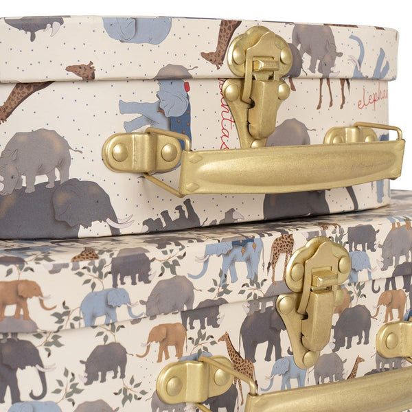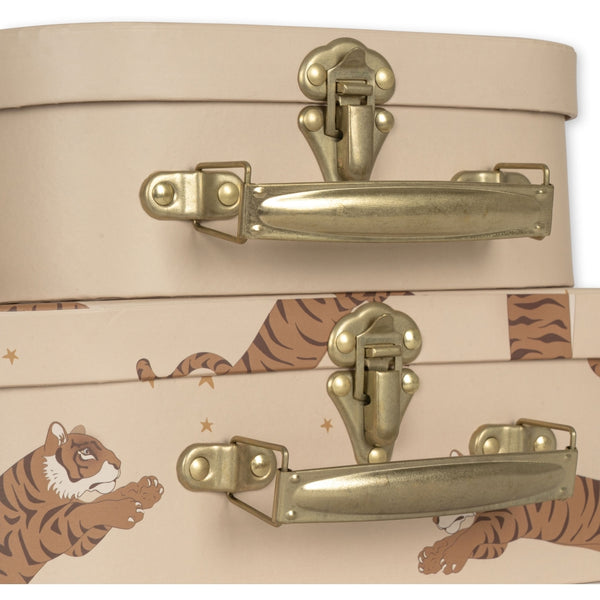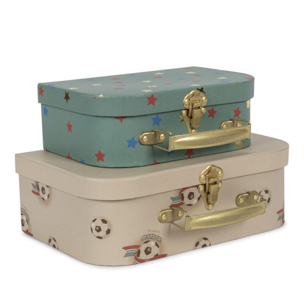 Set van twee kartonnen speelkoffers met een metalen handvat. De kleinere koffer past in de grotere. Ideaal voor het bewaren van kleine spulletjes en mooi als decoratie  maar ook als je kleintje uitlogeren gaat of een middagje naar opa en oma.