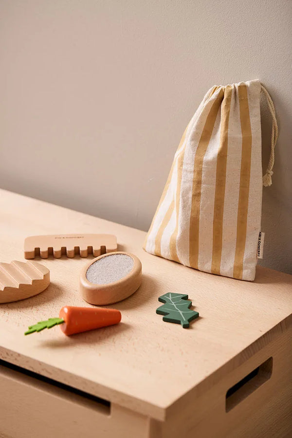 Met deze verzorgingsset van Kid's Concept beleven kinderen eindeloos plezier terwijl ze zorgen voor hun knuffels, hobbelpaarden of andere favoriete speeltjes. De set bevat twee borstels, een kam en speelgoedvoedsel zoals een wortel, appel en twee slablaadjes. Alles wordt netjes opgeborgen in een gestreepte katoenen tas, waardoor het eenvoudig mee te nemen is. Deze set stimuleert fantasierijk spel en leert kinderen spelenderwijs over zorg en verantwoordelijkheid.