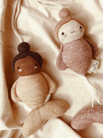 Activiteiten pull-down muziek speelgoed gemaakt van wol. Speelt slaapliedjes gedurende 100 seconden af als je aan de houten ring trekt. Voorzien van een praktische gebreide hanger.