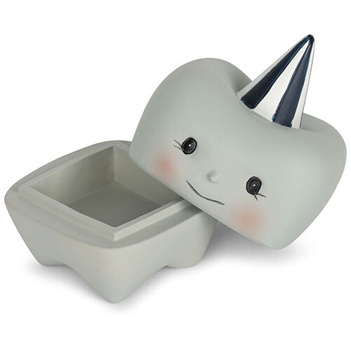 Dit grappige tandendoosje in de vorm van een tand, heeft een lachend gezichtje, roze wangetjes en een feesthoedje op. Geef het tandendoosje cadeau aan je kindje zodra hij of zij gaat wisselen of verras een vriendin op haar babyshower. Een tandendoosje gaat tenslotte heel je leven lang mee en krijgt vast en zeker een mooi plekje in huis. Het doosje is gemaakt van steen en bestaat uit twee delen.