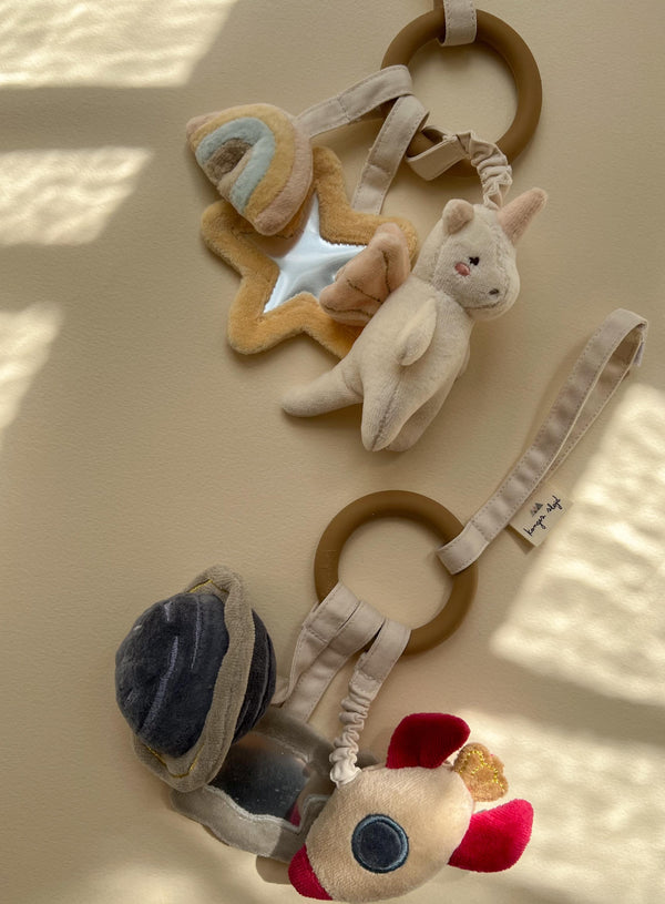 Dieser lustige und sichere Aktivitätsring ist perfekt für neugierige Babys! Er besteht aus 100 % Silikon, ist sicher zum Kauen und ideal für die Entwicklung der taktilen Fähigkeiten. Der Ring hat Bänder aus Bio-Baumwolle mit weichen Figuren, die mit recyceltem Polyester gefüllt sind. Ein Band ist elastisch, eine Figur hat einen Kunststoffspiegel und zwei Figuren machen ein leises Klimpern. Der Ring hat außerdem eine praktische Schlaufe zum Aufhängen des Spielzeugs.