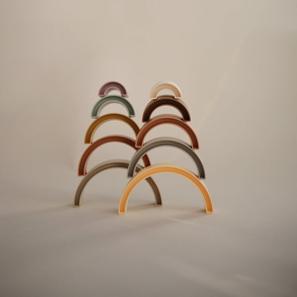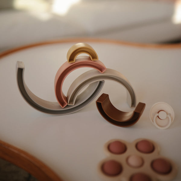 Verspielter Regenbogenstacker, inspiriert vom Regenbooghemel. Der Stapelturm besteht aus fünf Bögen zum Stapeln, Ausgleich und Sortieren.