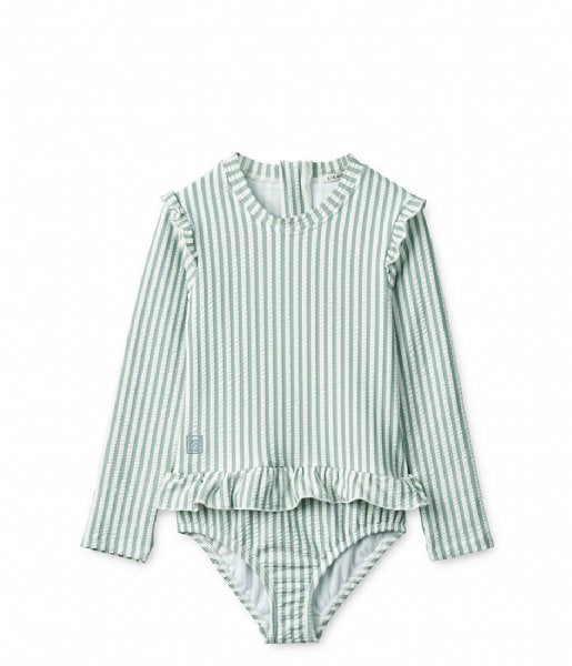 Badeanzug für Kinder mit langen Ärmeln und einem Reißverschluss auf dem Rücken. Stil und Komfort gehen Hand in Hand. Der Sille Badeanzug von Liewood Besteht aus recyceltem Polyester mit langen Ärmeln und Rüschen auf den Schultern und Taille eignet sich perfekt zum sicheren Spielen in der Sonne.