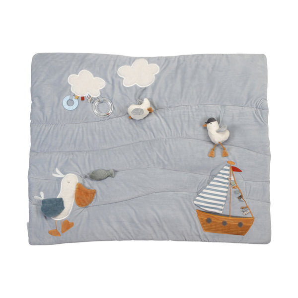 Little hands, big discoveries. This soft, harbor-inspired playpen rug encourages sensory development with different textures and activities. Your child will discover one fun surprise after another. From a seagull that squeaks when nipped, to a pelican with crisp wings and a fish in its beak. One of the clouds has a transparent ring that rattles when your baby plays with it. And hidden behind the sailboat's striped sail is a mirror for self-discovery.