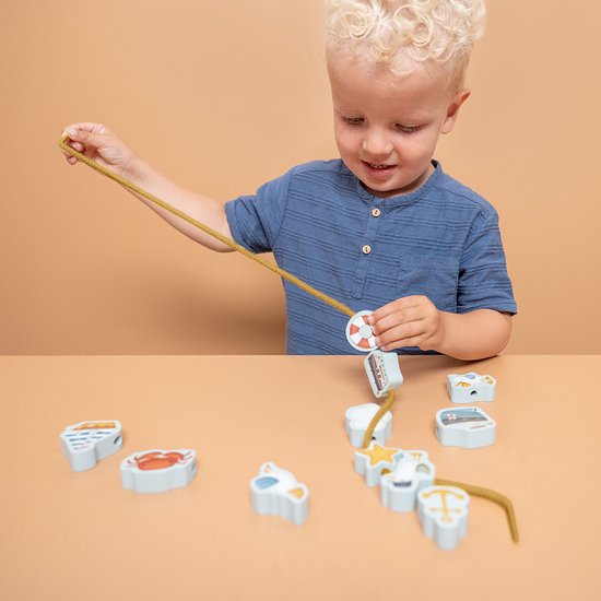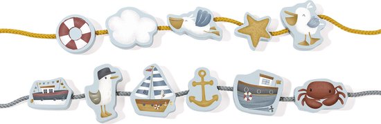Ahoy, little sailor! Experience a new adventure in the bay every time with these solid wooden stringing beads from Little Dutch. These wooden beads, which include images of a lighthouse, sailboat and birds from the Sailors Bay series, are extra large and have a large recess so little hands can easily thread them onto a lace. Includes 2 laces to thread on.