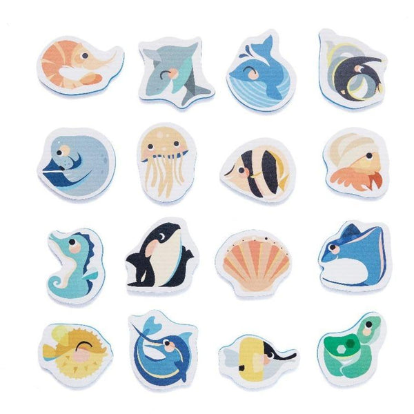 Bath toys made of foam for toddlers and preschoolers from 1 year old. 16 different sea animals for bathing, packed in a yellow storage bag, water permeable so perfect to keep the puzzle in.
