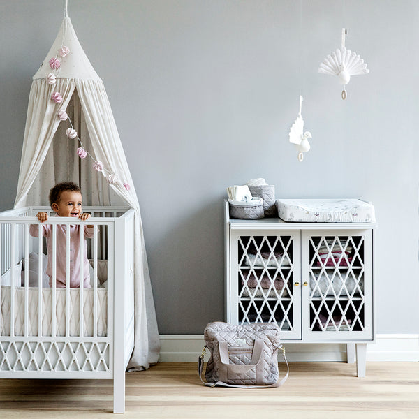 Bed canopy by Cam Cam made of 100% organic cotton. A creamy bed canopy hangs beautifully over the crib or in a corner of the room to create a cozy spot. Made of soft hydrophilic fabric, and available in petroleum color or cream white.