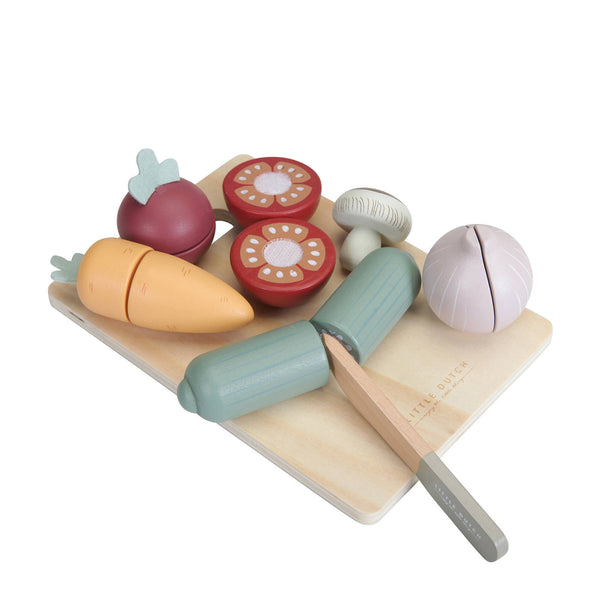 Eat vegetables every day! This set of wooden vegetables is a fun way to encourage role play in your child. Cooking together is so much fun! Chop the vegetables on the cutting board in half with the wooden knife and become a top chef. The included vegetables are: carrot, cucumber, tomato, onion, beet and a mushroom. Everything can be cut in half and is easily glued back together by the Velcro.