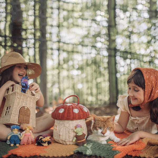 The Mushroom Basket has a generous size, an adjustable handle and a small door that opens and closes. Children can open the mushroom lid, store their treasures and take the basket anywhere. Whether storing secret treasures, soft toys or small items, this basket provides an enchanting storage solution for any adventure.