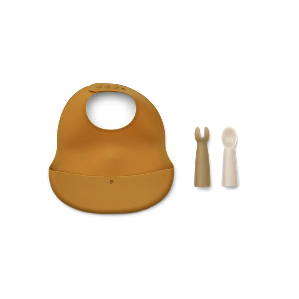 Un set de repas raffiné pour les premières collations indépendantes de votre bébé. L'ensemble comprend un bavoir en silicone, une cuillère et une fourchette. Les couverts sont emballés dans le bavoir pliable pour un rangement minimal. Idéal également comme cadeau de maternité durable.