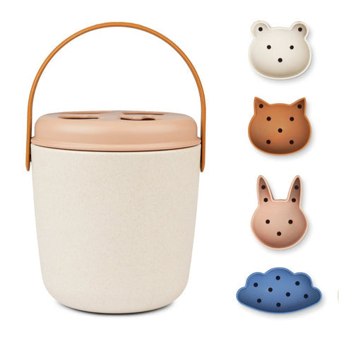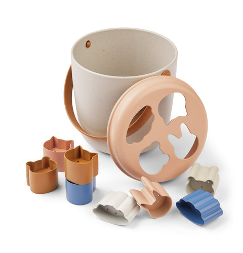 Liewood Jorn Beach Puzzle est un seau amusant avec un couvercle à formes et des formes d'animaux. Il peut être utilisé comme boîte à puzzle à la plage, mais aussi à l'intérieur. Les formes sont percées de trous pour permettre à l'eau de couler à travers elles.