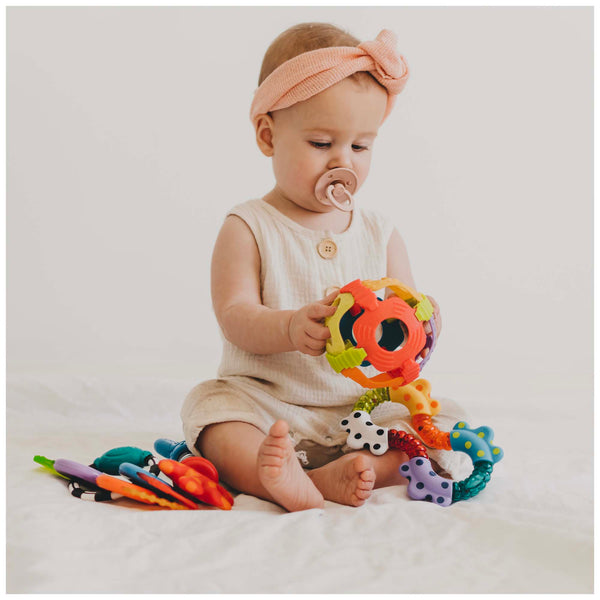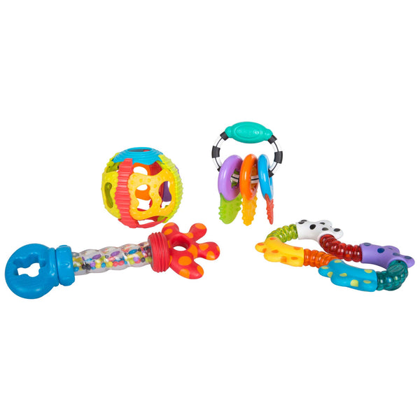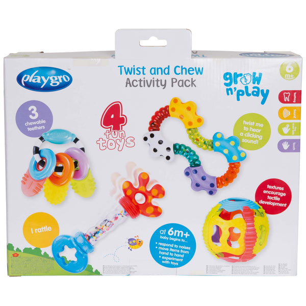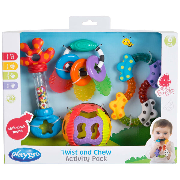 Le jeu de hochets Playgro est le cadeau idéal pour les bébés dont les dents poussent et qui commencent à découvrir leur sens du toucher. Laissez votre bébé agiter le hochet et faire rouler la balle pendant que le son encourage le mouvement. Les hochets faciles à tenir émettent des sons de clic-clac pour une stimulation auditive. Comprend 4 jouets d'éveil contenant des anneaux de dentition striés pour soulager la douleur des poussées dentaires, des sons de hochet pour le développement auditif, différentes textures pour le développement tactile. Convient à partir de 6 mois.