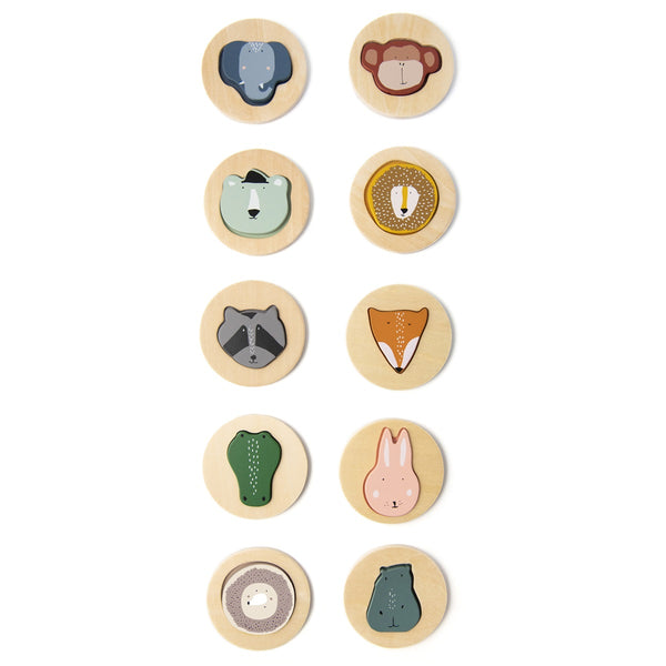Dit spel kan je op veel leuke manieren spelen! Het is een leuke eerste puzzel, waarbij je probeert de dierenkop in de juiste cirkel te passen. Maar de pret begint pas echt als je samen speelt en probeert om zoveel mogelijk dieren met de juiste cirkel te matchen. Elke speler trekt een aantal dierenhoofden. De schijfjes worden met de bovenkant naar beneden op tafel gelegd. Elke beurt kan een speler een cirkel ronddraaien en controleren of deze overeenkomt met een van zijn of haar dieren. De eerste die alle dieren verzameld heeft, wint! Dit spel oefent zowel motorische als cognitieve vaardigheden. In het begin zullen kinderen het leuk vinden om over kleuren en dieren te leren. Eens wat ouder zullen ze de spanning van het spel ontdekken terwijl ze spelenderwijs hun geheugen trainen. Alle elementen zijn gemaakt van 100% FSC © gecertificeerd hout. Alle verven zijn op waterbasis en veilig voor baby's.